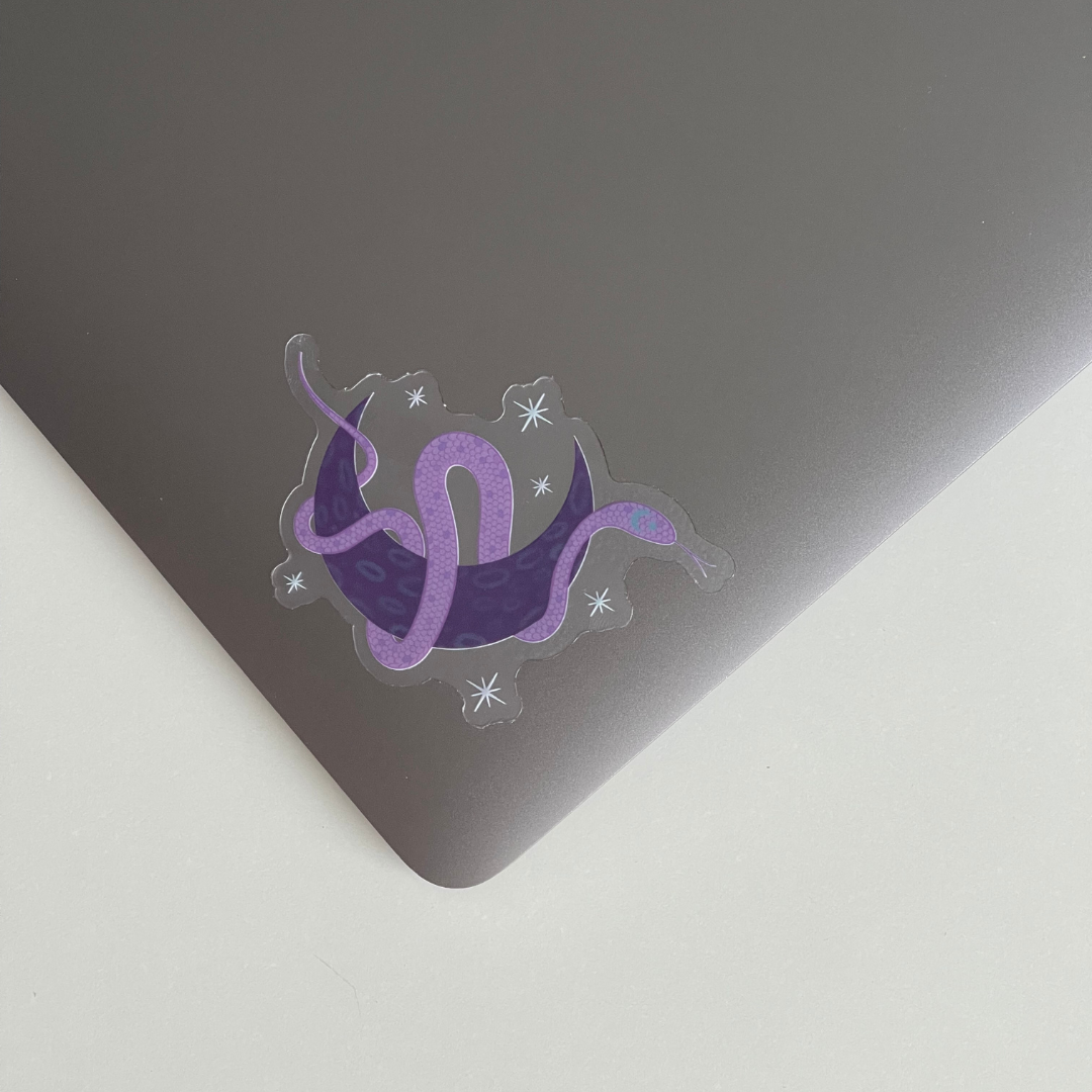 STICKER Clear Purple Snake Crescent Moon Witchy Spooky Goth | Transparent 3 Inch Waterproof Sticker for Water Bottle, Laptop, Car, E-Reader